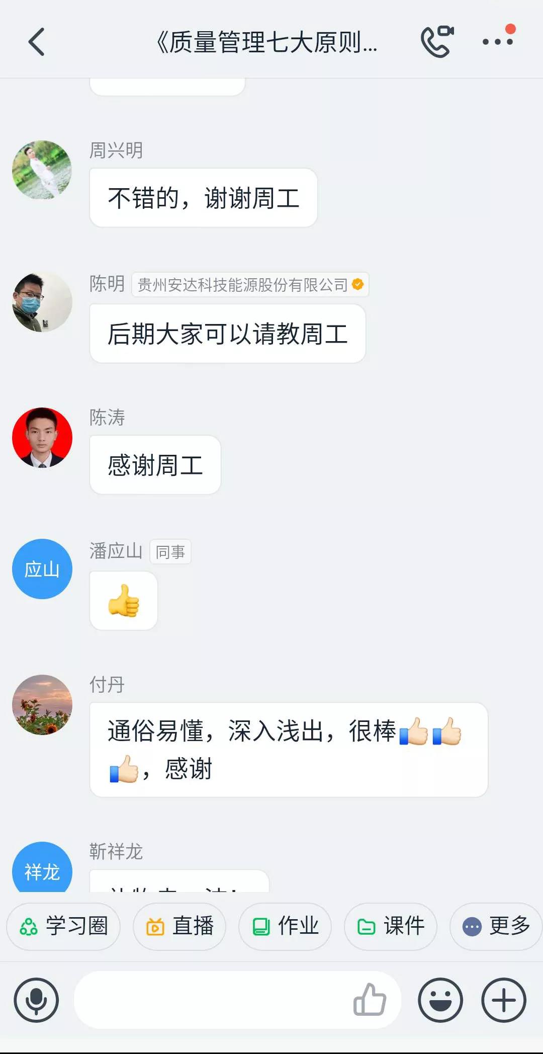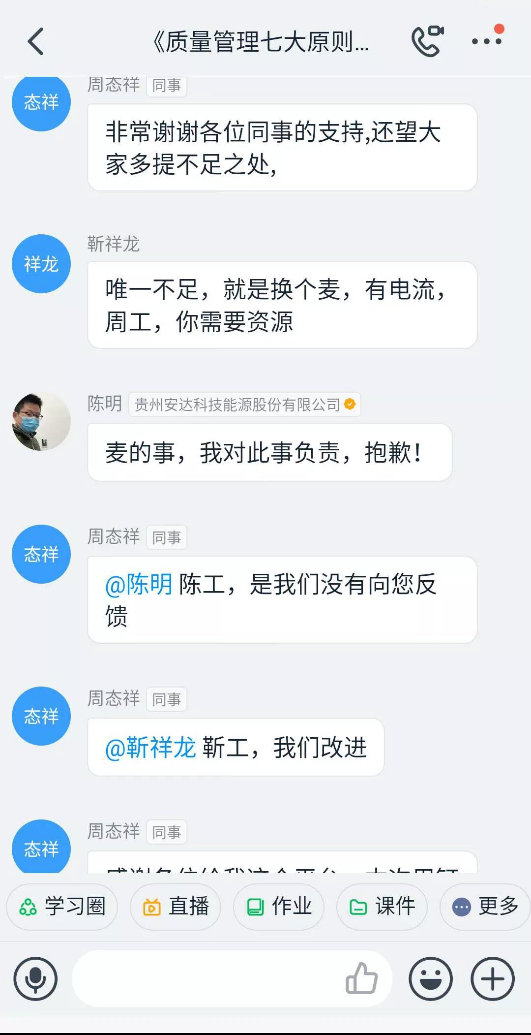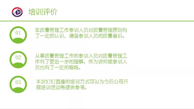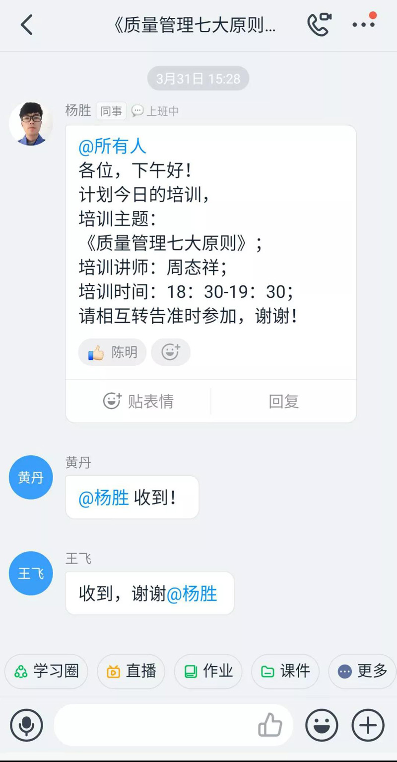 18點30分,隨著培訓講師周態(tài)祥在直播群里向大家問好聲落下,本次釘釘直播培訓正式拉開帷幕。毫不拖泥帶水,講師準時開始本次培訓主題內容的講解,即質量管理七大原則。伴隨著講師幽默、通俗易懂的講課方式和參訓人員的積極互動,整個培訓過程進行得十分順利。