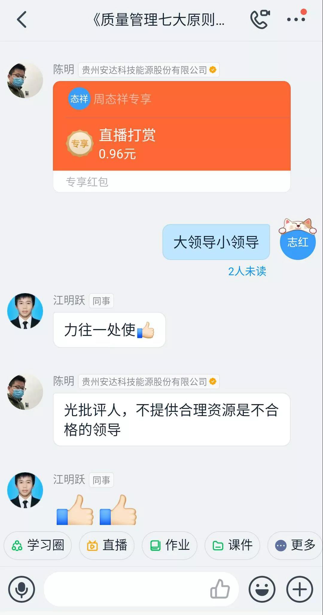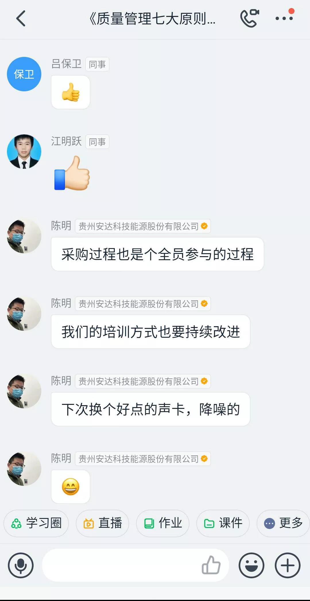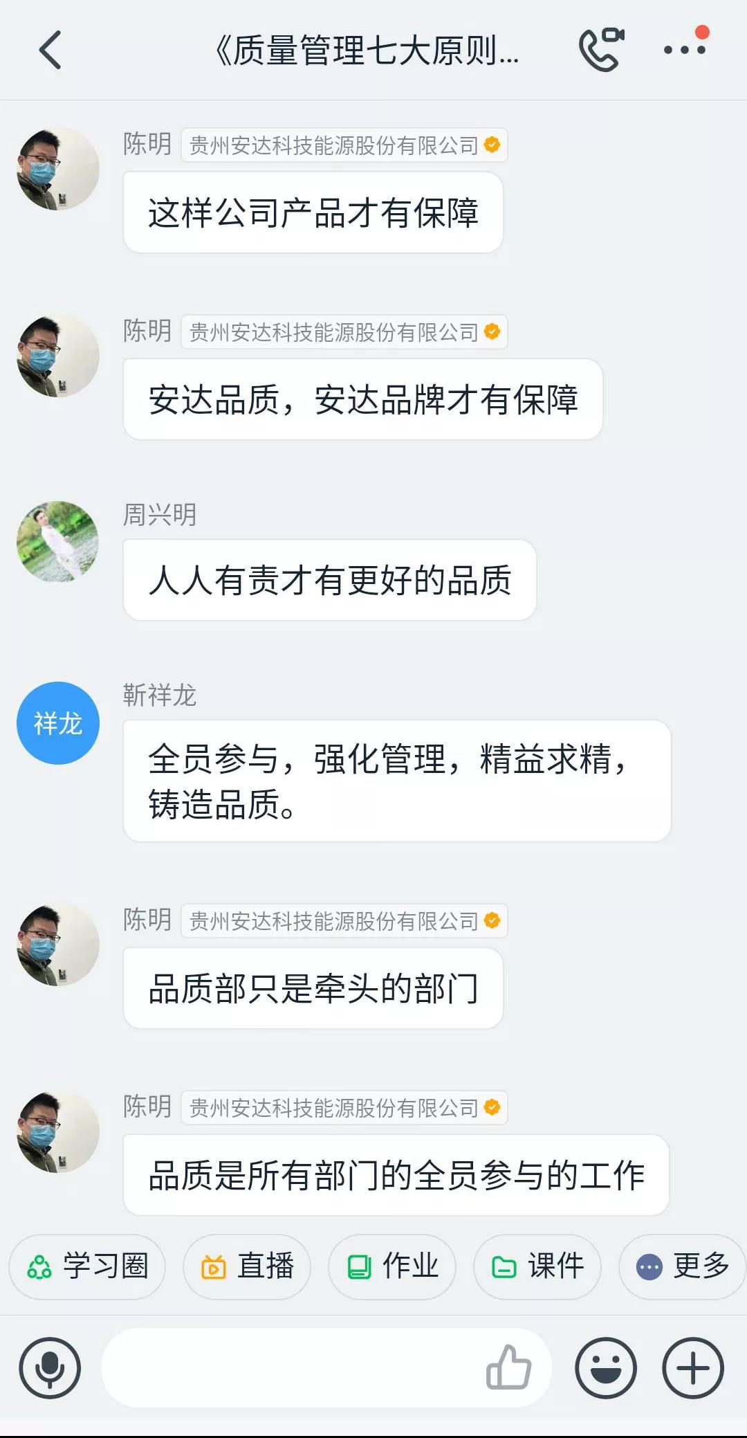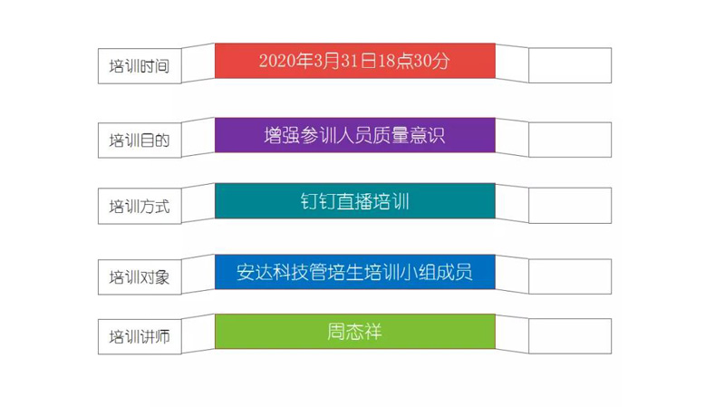 為了增強管培生質量管理意識,2020年3月31日下午18點30分,貴州安達科技能源股份有限公司管培生培訓小組全體成員開展了一場關于ISO9001:2015版之質量管理七大原則的培訓,本次培訓受時間空間限制的同時為了響應預防新冠狀病毒政策采取了釘釘直播培訓的方式。培訓由管培生管理小組(委員會)陳明擔任直播指導員,周態(tài)祥擔任培訓講師;楊勝、李孟然等負責直播前的技術準備工作,除去出差的人員,直播參加人數達42人。