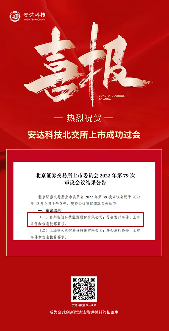 近日,北京證券交易所上市委員會2022年第79次審議會議結(jié)果公告顯示:貴州安達(dá)科技能源股份有限公司(以下簡稱“安達(dá)科技”、“公司”)(830809.NQ)符合發(fā)行條件、上市條件和披露要求,成功過會。